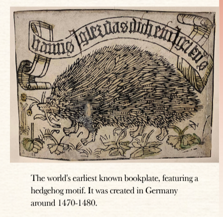 Европейские экслибрисы появились около 1470 года и связаны с печатными книгами, тогда как китайские печати книжных коллекционеров восходят по крайней мере к VI веку и встречаются на книгах и других коллекционных предметах, особенно на картинах и произведениях каллиграфии. Самый ранний известный в мире экслибрис с мотивом ежа. Он был создан в Германии около 1470-1480 годов.